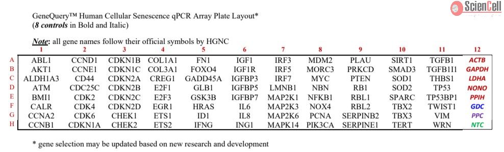 ScienCell's GeneQuery™ Human Cellular Senescence qPCR Array Kit (GQH-CS) profiles 88 genes involved in human cellular senescence.