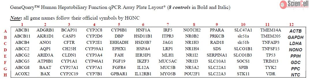 ScienCell's Human Hepatobiliary Function qPCR Array Kit (GQH-HHB) is designed for comprehensive gene expression profiling of 88 genes central to bile synthesis, secretion, transport, and regulation.