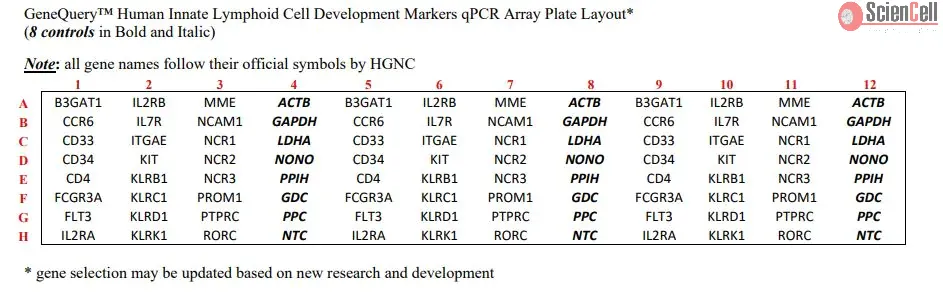 GeneQuery™ Human Innate Lymphoid Cell Development Markers qPCR Array Kit (GQH-ILC) is qPCR ready in a 96-well plate format, with each well containing one primer set that can specifically recognize and efficiently amplify a target gene's cDNA.