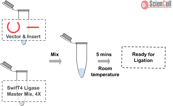 ScienCell’s SwifT4 Ligase Master Mix (T4LIGMM) is a 4X premix that simplifies the reaction setup while also ensuring rapid ligation at room temperature. T4LIGMM is ideal for use with both sticky-end and blunt-end DNA and needs only 5 minutes for the ligation reaction. The 4X premix contains an optimized ratio of enzyme, buffer and transformation enhancer. As it maintains a liquid state during storage at -20°C, no thawing of the master mix is required. Simply combine T4LIGMM and DNA, the resulting reaction mixture may then be used directly for bacterial transformation.